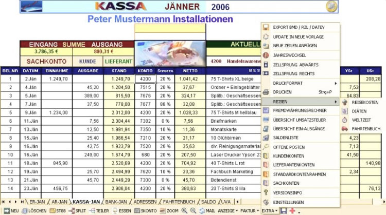 Die Steuerung der SIMPLE FINANZBUCHHALTUNG erfolgt über die Symbolleiste: In Excel 2003 ist sie im unteren Bereich der Vorlage; ab Excel 2007 ist Sie im Excel-Register ADDINS.