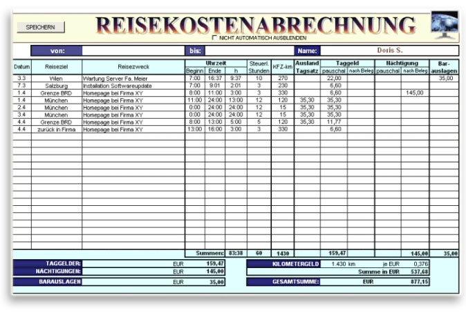 Reisekosten können direkt in der Vorlage erfasst werden - dabei können die Taggelder sowohl bei Inlandsreisen wie auch bei Auslandsreisen automatisch ermittelt werden.
